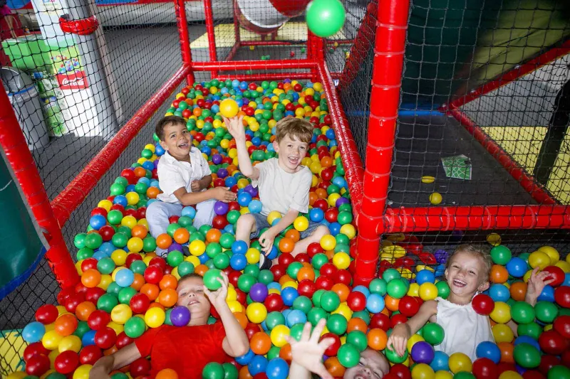 L'espace de jeu comprend un impressionnant labyrinthe géant sur plusieurs niveaux, agrémenté de ponts de singes et de toboggans excitants. Les enfants peuvent s'amuser dans les châteaux gonflables, sauter sur les trampolines ou piloter des mini-voitures électriques sur un circuit dédié. Les plus petits apprécieront le parcours de trotteurs et les bains de boules. À l'extérieur, une terrasse aménagée propose des jeux de plein air avec toboggans, pont de singe, balançoire et table à sable, parfaits pour profiter des beaux jours.